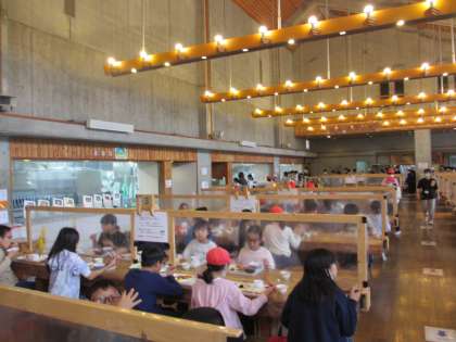 2日目の活動に備えて、しっかりと朝食をとります。パンかご飯、みそ汁かスープ、どれにするか自分で選んで食べます。