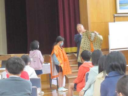 毎年5月5日に上賀茂神社で行われる「賀茂競馬」について、保存会の堀川さんからお話していただきました。天下泰平や五穀豊穣を願って行われること、今年で930年を迎える行事であることなどをお話しくださいました。また、実際に使われる馬具に触れたり、馬の乗り手が着る装束を見せていただいたりしました。地域の方々が伝統を大切に継承されてきたことが子どもたちに伝わり、興味をもってお話を聞いていました。