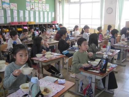 今日は、月に1回の和献立の日でした。献立は「麦ごはん なま節と厚揚げの煮つけ 春野菜のみそ汁」。なま節と厚揚げの煮つけにはたけのこも入っていて、今が旬の食べ物を味わうことのできる献立でした。子どもたちも味わいながら食べていました。ごちそうさまでした。