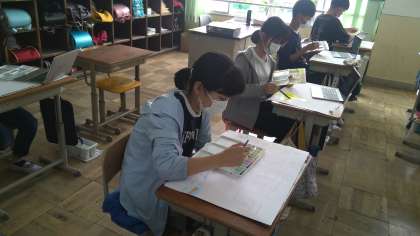 修学旅行の疲れも残る中、1時間目から集中して自分の作品と向き合っていました。絵の具の量、種類、水とのバランスなど、工夫を凝らしています。