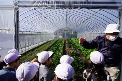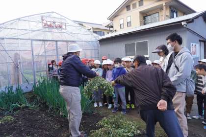 冬野菜の「かぶ」や「ほうれん草」「ブロッコリー」など普段スーパーマーケットなどで売られている野菜を間近で見ることができました。出荷前の野菜は大きな葉が付いていて、畝の中から立派に育っていました。