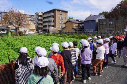 社会科「農家でつくられるもの」の学習で、地域の十塚さん、松宮さんにご協力いただき、畑の見学をしました。