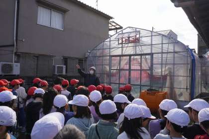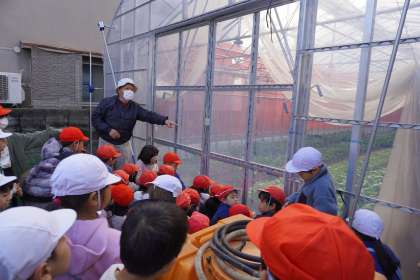 「水はけをよくするために畝をつくっています。」「暖かいところで少しでも早く育てるためにビニルハウスで育てています。」「ルールを守って野菜作りをしています。」と野菜作りで気を付けていること、野菜づくりに対する思いを学ぶことができました。