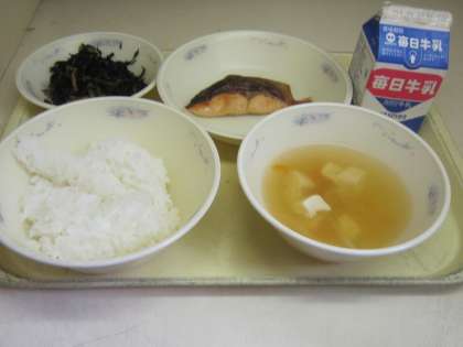 今日の献立は、ごはん・さけの塩こうじ焼き・ひじきの煮つけ・キャベツのすまし汁・牛乳でした。