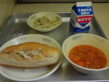 今日の献立は、コッペパン・ミネストローネ・ツナサンド・チーズ・牛乳でした。