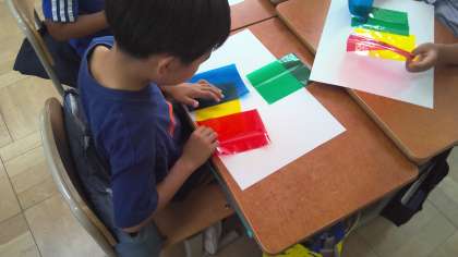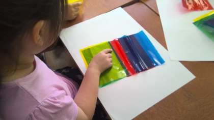 セロハンを重ねて、様々な色を作り、楽しみながら