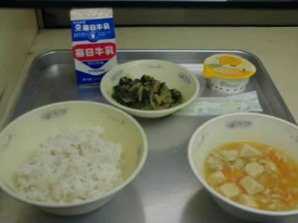 今日の献立は、麦ごはん・高野どうふのそぼろ煮・ほうれん草と切干大根のごま煮・牛乳でした。