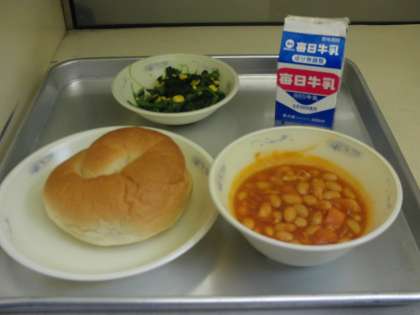 今日の献立は、バターうずまきパン・大豆と鶏肉のトマト煮・ほうれん草のソテー・牛乳でした。