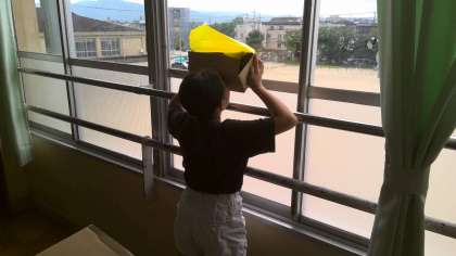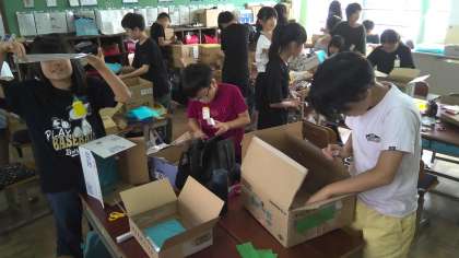 5年 図画工作科「のぞいてみると」の学習をしました。万華鏡のように、段ボールなどの箱に覗き穴を作って、光が入るように小さな穴をあけていきました。穴に色紙を貼って光を色付きにしたり、中にアルミ箔を貼り付けて入った光を反射させたりして作品を作っていきました。何度も覗きながら作品づくりに励み、最後は友達と出来上がったものを鑑賞し合っていました。
