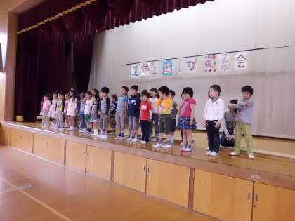 6年生と1年生が手をつなぎ入場をし,各学年からお祝いの出し物やことばが披露されました。最後に1年生も「おれい」の歌を歌いました。