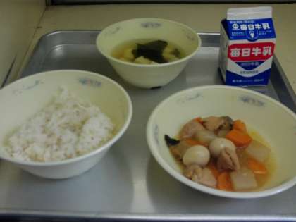 今日の献立は、 麦ごはん・プリプリ中華いため・わかめスープ・牛乳でした。
