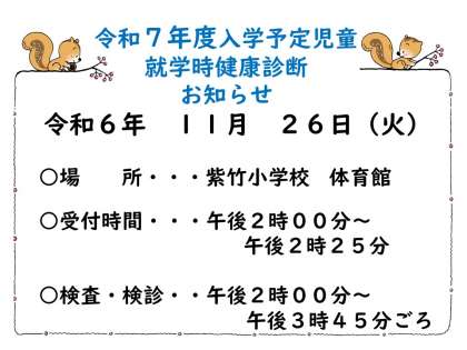 さて、令和7年度入学予定児童の就学時健康診断を11月26日(金)に実施いたします。ご予定いただきますよう、お願いいたします。