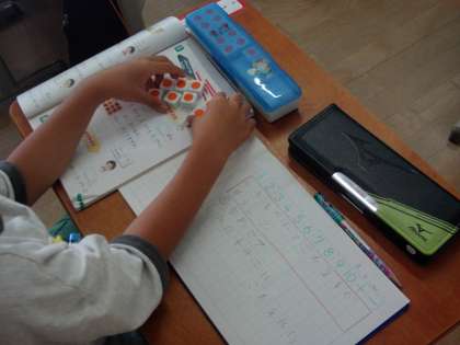 問題文を読んで式を書き答えを出します。すうずブロックを使って計算しました。たしざんかひきざんか、問題文のキーワードを見つけて式を計算できました。