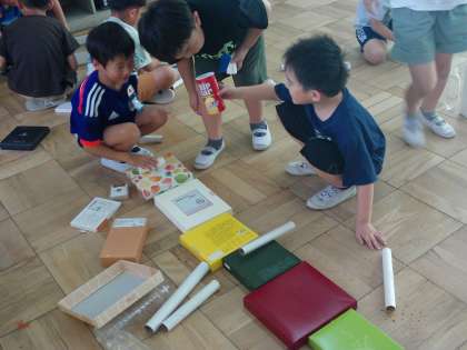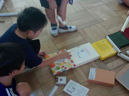 ご家庭で集めていただいた空箱やペットボトル、カップなどの材料を組み合わせて、遊びのわざをみつけました。当てたり、転がしたり、並べたり、いろいろな遊びを見つけることができました。