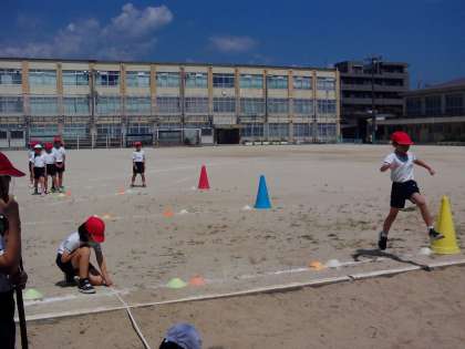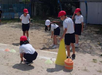 跳ぶグループと、計測・地面をほうきでならすグループにわかれて、交代で跳びました。地面をならして準備ができたら、次に跳ぶ子に合図して、スムーズに進めることができました。