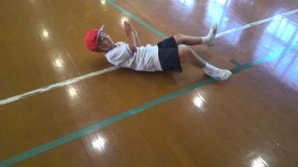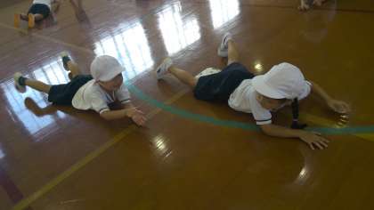 音楽に合わせて、いろいろな虫に変身しました。虫になりきって歩いたり、跳んだりして楽しそうにしています。上手に虫に変身できたので、動物にも挑戦しました。