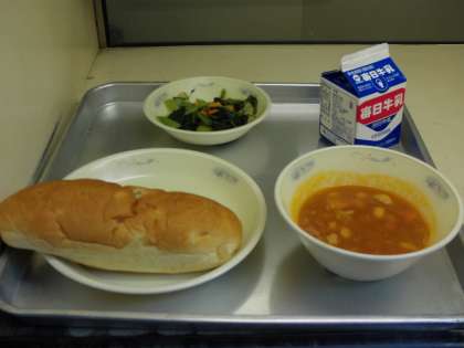 今日の献立は、おさつパン・ポークビーンズ・小松菜のソテー・牛乳でした。