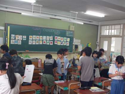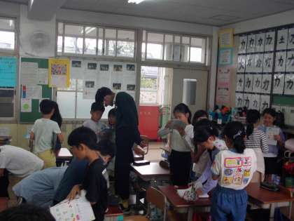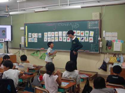 先生に続いて単語を繰り返し言ったり、歌を歌ったりした後、好きな食べ物やスポーツなどを尋ね合いました。