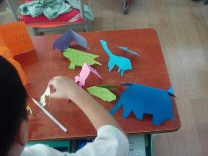 自分の好きな動物や建物を色画用紙で作り、街を作りました。その街の写真を撮り、アピールポイントやがんばったところ、工夫したところにしるしをつけ、タブレットで写真を提出しました。