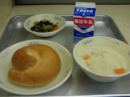 今日の献立は、ミルクコッペパン・キャベツの米粉クリーム煮・小松菜のソテー・牛乳でした。