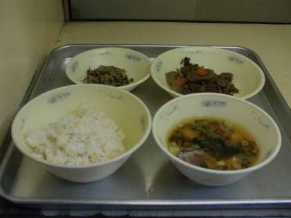 今日の献立は、麦ごはん・牛肉とごぼうの煮つけ・しば漬ちりめん・なめこのみそ汁でした。