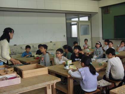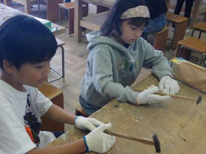 今日は、金づちの使い方や安全にくぎを打つ方法を学び、実際に木にくぎを打つ練習をしました。