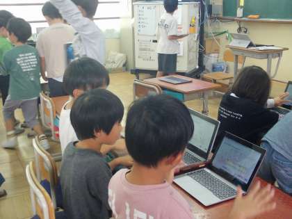 2年生は音楽で「おまつりの音楽」について学習しています。自分が作ったリズムと友達が作ったリズムをつなげ,自分たちだけの「おまつりの音楽」をつくりました。くりかえすリズムが同じ人と演奏すると息が合いやすいことに気が付きました。また,自分たちの「おまつりの音楽」をクラスの仲間に発表しました。大きな太鼓でドン!ドン!と楽しく演奏することができました。