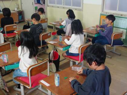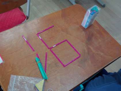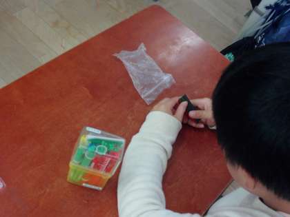 今日は色板やかぞえ棒を動かして、形を作りました。先生が黒板に貼ったかたちと同じ形を作ったり、かぞえ棒を使って数字を作ったりしました。