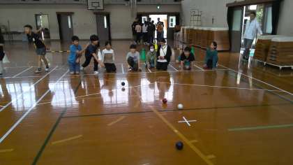ボッチャ体験の様子です。経験のある子供たちもいましたが、難しかったようでした。「これなら障がいの有無に関わらず一緒に楽しめそう!」とボッチャの魅力に気づいたようでした。