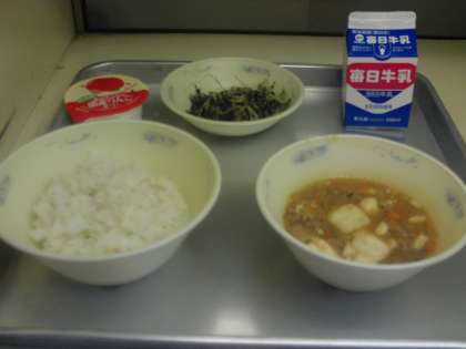 今日の献立は、麦ごはん・五目どうふ・ひじきと野菜のいためナムル・りんごゼリー・牛乳でした。