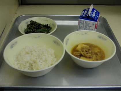 今日の献立は、麦ごはん・肉じゃが(カレー味)・ほうれん草とじゃこのいためもの・牛乳でした。