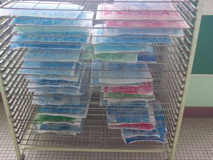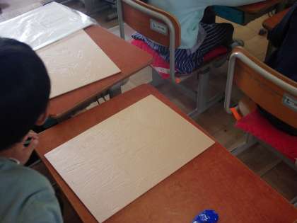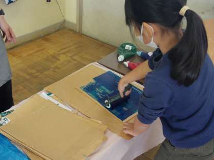 いろいろな線を使って、自分が行ってみたい世界をかきました。インクをローラーで丁寧に塗り、紙に色を写し、素敵な作品ができあがりました。