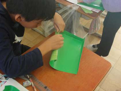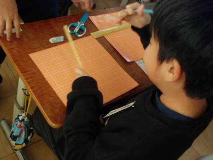 今日は、カラー方眼紙を切ったり折ったりして、大小のお皿や支柱を作りました。
