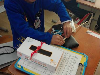 発明したおもちゃの名前や使う道具、設計図をシートに書きました。そのあと空き箱やわりばし、毛糸などを使っていろいろなおもちゃを完成させました。