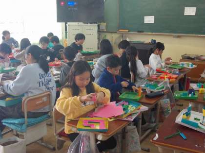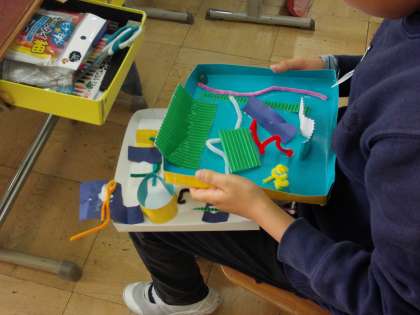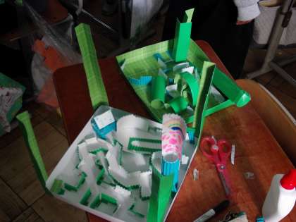 立体めいろ作りで、各階のめいろが仕上がってきました。柱を立てたり、ビー玉を動かして確かめたりして、仕上げの調整しました。