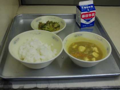 今日の献立は、ごはん(京北米)・和風カレーどうふ・ブロッコリーのおかか煮・牛乳でした。