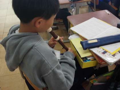 リコーダーは、高いレとミの練習をしたり、先生の伴奏にあわせてみんなで合奏したりしました。季節の歌「もみじ」は、上のパートと下のパートに分かれて合わせて歌いました。