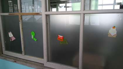 下の写真は飾り係が廊下の窓に1月の飾りをつけてくれました。