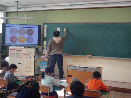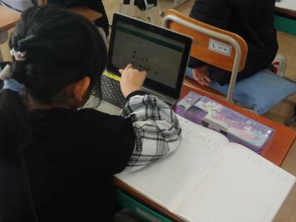 「28円のガムを買うとき、どうやってお金を出すかな。」という問題では、20円分を十円玉2枚で出したり、五円玉5枚で出したり、タブレットのロイロノートでお金を動かしながら確かめました。