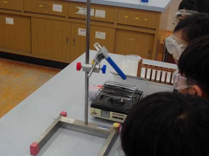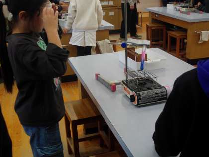 4年生は理科で水の温まり方について学習しています。今日は試験管の中の水を熱し,どこから温まるのかを観察しました。示温インクを用い,青色からピンク色へと色の変化を見ました。