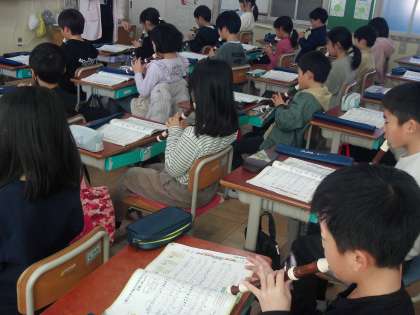 リコーダーで「パフ」の練習をしています。上と下の2つのパートに分かれて練習しました。
