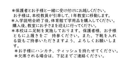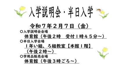 厳しい寒さが続いております。就学時健康診断の際にお知らせしたとおり、2月7日(金)に入学説明会・半日入学を実施いたします。
