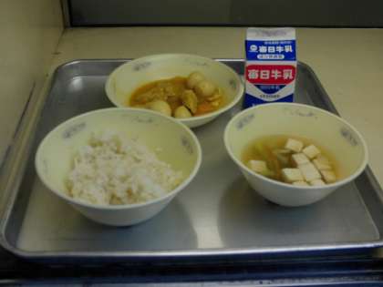 今日の献立は、麦ごはん・鶏肉とうずら卵のスパイシーいため・とうふと青菜のスープ・牛乳でした。