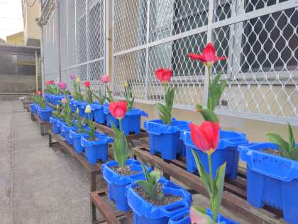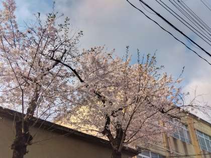 正門にあるしだれ桜は満開です。学校の北側、竹殿南通沿いの桜は、少し散ってきましたがきれいに咲いています。チューリップも咲き出しました。明日の始業式、入学式もきれいな花が見られそうです。