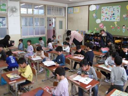 1年生、朝の登校して教室に入り、ランドセルを置いて、持ち物を取り出して学習の用意がうまくできるようになってます。その後は「今日は何の本を読もうかな」朝読書の時間です。毎日、励んでいる1年生です。「すごいね!」