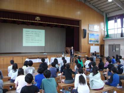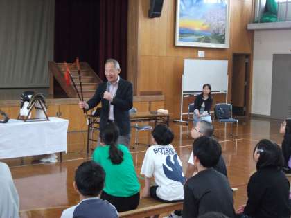 一般財団法人賀茂県主同族会 理事長 堀川様に来ていただき、本校近く、子どもたちもよく知っている上賀茂神社に930年にわたり、脈々と伝わる古式競馬について歴史や、その特徴、これから我々が取り組むことなどについて教えていただきました。賀茂競馬は長きに渡り、平安時代と同様の儀式を今に伝える伝統行事であることや、源氏、織田氏、豊臣氏、徳川氏などその時代の人物や、営みに密接な関りがあることを、実際の馬具をお持ちいただき、触れさせていただき、丁寧に教えていただきました。