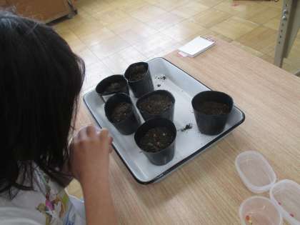 トウモロコシの種を3粒ずつポットにまきました。その後、やさしく水をかけていました。理科の交流学習では、春の生き物の様子をタブレットを使って写真に撮っていました。