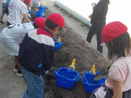夏においしい野菜を植えました。トマト・ピーマン・オクラの中から、自分で野菜を選んでうえきばちと畑に植えました。水をたっぷりあげました。大きくなるのが楽しみです。
