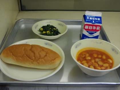 今日の献立は、味つけコッペパン・大豆と鶏肉のトマト煮・ほうれん草のソテー・牛乳でした。