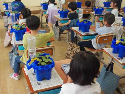 前回はふたばだった葉が、「大きくなった。」「葉っぱが増えた。」「新しい葉っぱは形が違う。」「前の葉っぱはつるつるだったけど、新しい葉っぱはふわふわしている。」など、たくさんの発見がありました。